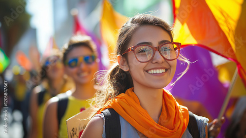 Workers’ Parade: A group of workers from diverse industries marching in a Labor Day parade, holding colorful banners and signs advocating workers’ rights, with a festive outdoor setting and bright day