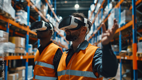 Workers using virtual reality (VR) headsets for training in a warehouse