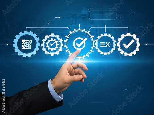 Workflow and flowchart. Business process automation (BPA) technology. Businessman touching checkmark and gears icon on flowchart.