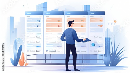 Workflow project schedule with a timeline, person in front of a board who is planning resource on working tasks