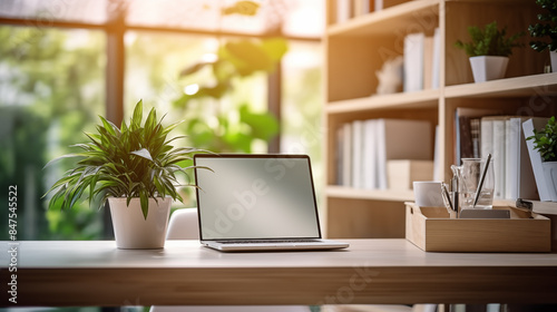 Working space in the office. Laptop on the table, green plant and booking shelf on the background