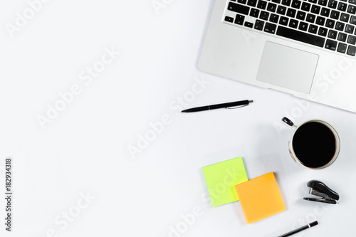 Working table top view, flat lay. Business items on a white table, laptop, phone, pens, stickers. Copy Space, Concept of business attributes.