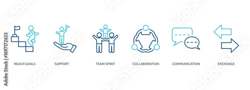 working together outline color banner icon of reach goals, support, team spirit, collaboration, communication, exchange