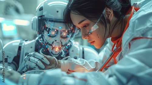 Working together, Robot assisting a nurse in a healthcare setting, checking patient vitals. surrealistic Illustration image,