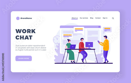 Working web chat. Digital communication of work team in office and remotely. Social groups for employees with information projects. Conference on mobile applications. Vector landing page flat banner
