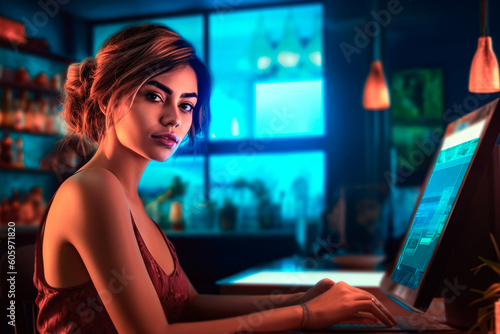 Working woman in a bar typing on a computer