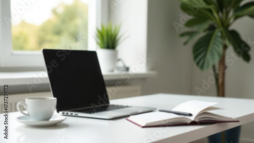 Workplace in light backgrounds by the window. Laptop, notebook and cup of coffee on a white table