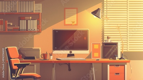 Workplace room, modern Interior, cabinet. Office with computer. Colorful vector illustration in flat cartoon style.