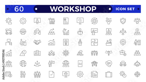 Workshop icon set. Containing team building, collaboration, teamwork, coaching, problem-solving and education icons. Set of line icons related to training, mentoring, meeting Outline icon collection.