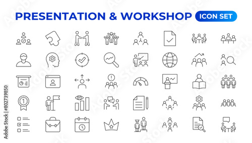 Workshop icon set. Containing team building, collaboration, teamwork, coaching, problem-solving and education icons.Business presentation line icons Presentation, business, seminar, partnership, goals