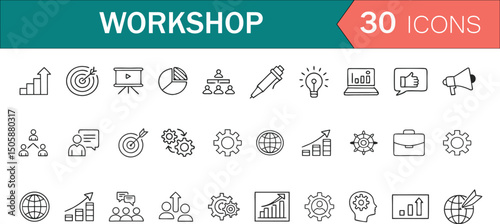 Workshop set of web icons in line style. Business Workshop icons for web and mobile app. Containing team building, teamwork, coaching, meeting, managing, coaching, motivation and more
