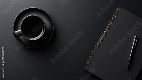Workspace Still Life: Black Coffee, Notebook, and Pen on a Dark Background