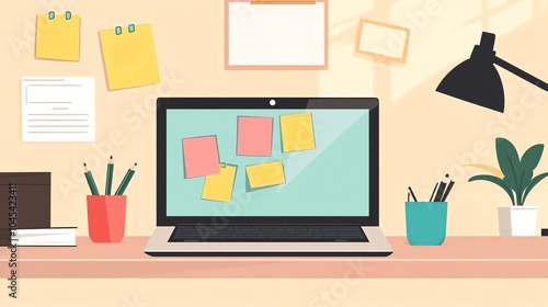 Workspace with a laptop displaying sticky notes, surrounded by office supplies and a plant.