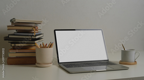 Workspace with laptop, notebook, stack of books and vase in home office room