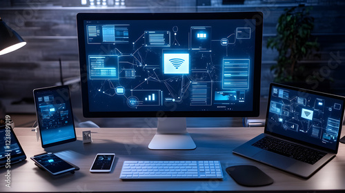 workspace with multiple mobile devices connected to a centralized management system on a large monitor