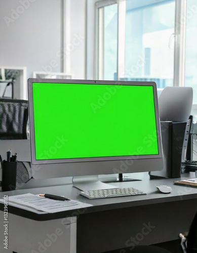 Workstation Setup Featuring a Computer Monitor with a Green Screen for Video Production