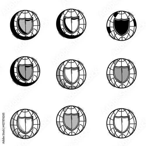 World and shield doodle vector icon. Drawing sketch illustration hand drawn line eps10
