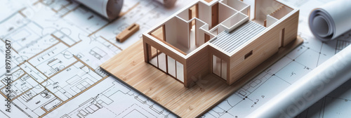 World Architecture Day, architect. 3d model of a building, a house. The drawings are on the table. building project