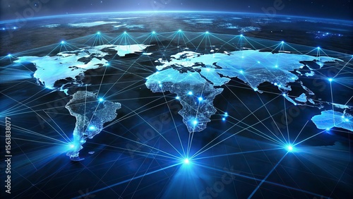 World map on a technological background, glowing lines symbols of the Internet, radio, television, mobile and satellite communications.Global network connection over the world. 3d rendering