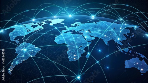 World map on a technological background, glowing lines symbols of the Internet, world map newtwork.
