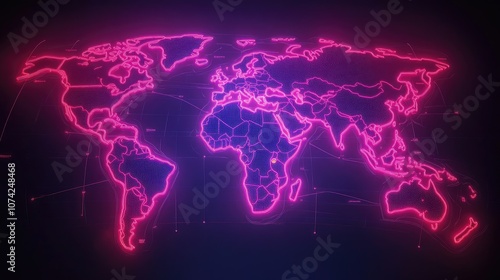 World map with bright neon outlines of continents and bright data points for major cities