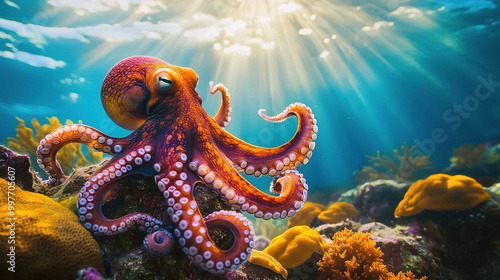 World Octopus Day. Octopus in the sea. Cute octopus in an underwater coral reef. Colorful octopuses in anemones on the background of coral reefs. Beautiful octopus underwater. Copy space area
