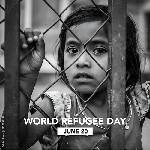 World refugee day commemoration showing a young girl behind a fence in monochrome