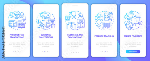 Worldwide e-marketplace service onboarding mobile app page screen. Secure payments walkthrough 5 steps graphic instructions with concepts. UI, UX, GUI vector template with linear color illustrations