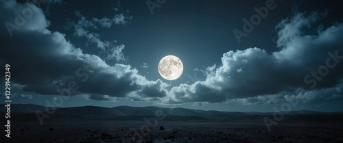 Worm moon illuminating dark plain under swirling clouds, mystical ambiance