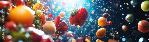 Worms-eye view of a cosmic kitchen, vibrant colorful ingredients floating in zero gravity, innovative starry lighting, culinary tools orbiting, surreal ambiance