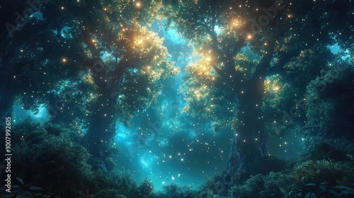 Worms-eye view of a vibrant fantasy forest, intertwined with shimmering galaxies, glowing constellations shining through the foliage