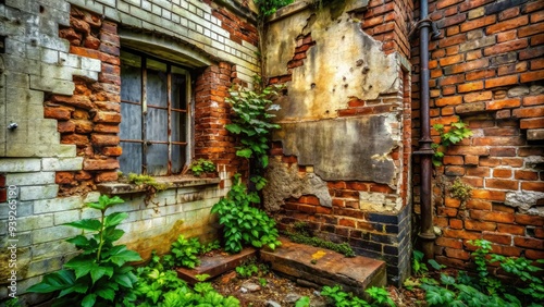 Worn, peeling paint and rusted metal reveal a neglected corner, surrounded by crumbling bricks and overgrown with weeds, exuding a sense of decay and abandonment.