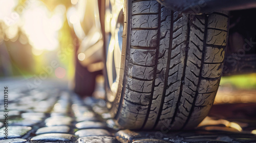 Worn Tire on Cobblestones: Time for a Change. Close up of a worn car tire on cobblestones, emphasizing the need for tire replacement and road safety.