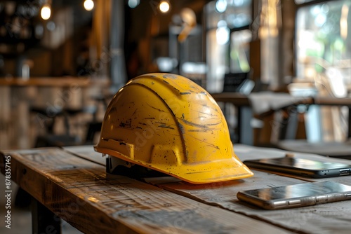 Worn Yellow Hard Hat on a Wooden Table in a Workshop