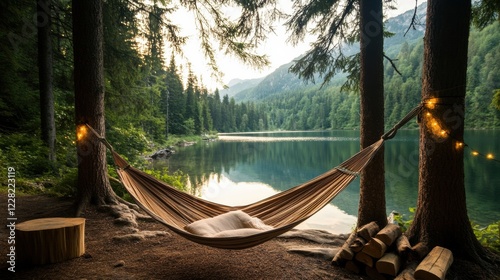 Woven macrame hammock hanging between two blooming trees in a lush green garden