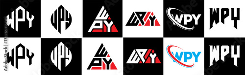 WPY letter logo design in six style. WPY polygon, circle, triangle, hexagon, flat and simple style with black and white color variation letter logo set in one artboard. WPY minimalist and classic logo