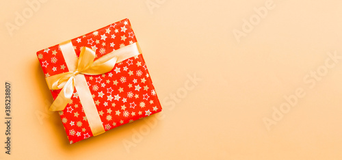 wrapped Christmas or other holiday handmade present in paper with Gold ribbon on orange background. Present box, decoration of gift on colored table, top view with copy space