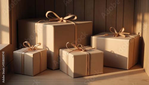 Wrapped gift boxes with ribbons neatly organized in a cozy setting