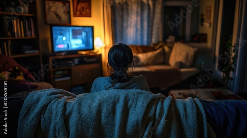 Wrapped in a blanket, a person sits in the dark on a couch, surrounded by shadows and low lighting