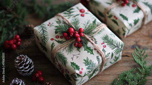 Wrapped presents in festive paper with pine branches and red berries create warm holiday atmosphere. Perfect for celebrating season!