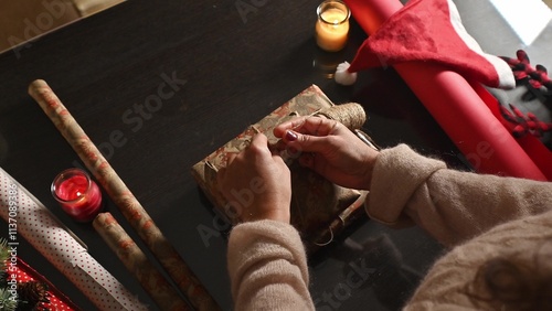 Wrapping gift on festive table