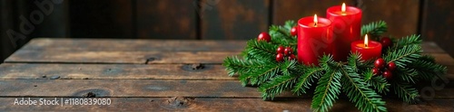 Wreath of decorated evergreen branches and red candles on a rustic table, table, candles, rustic