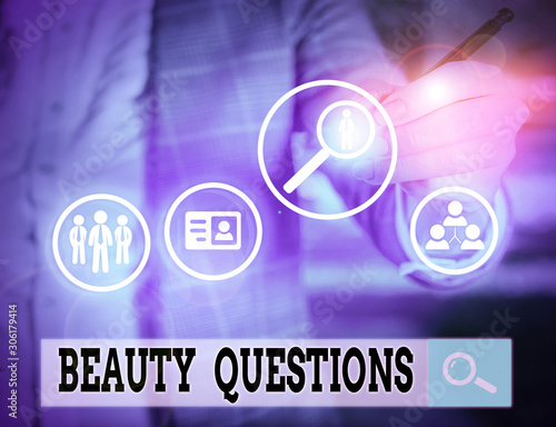 Writing note showing Beauty Questions. Business concept for a sentence or phrase used to find out information