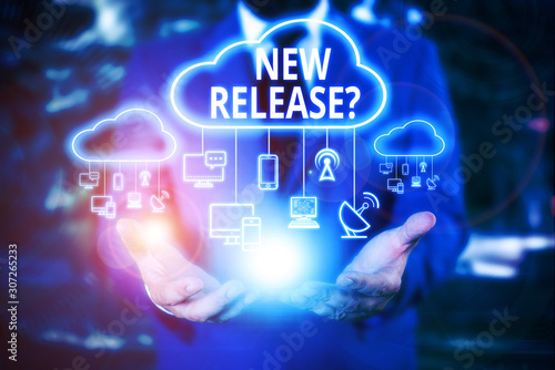Writing note showing New Release Question. Business concept for asking about recent product or service newly unleashed Male wear formal work suit presenting presentation smart device