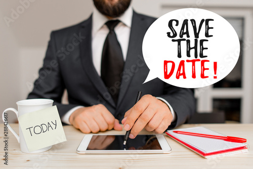 Writing note showing Save The Date. Business concept for reserve the mentioned future wedding date on their calendar