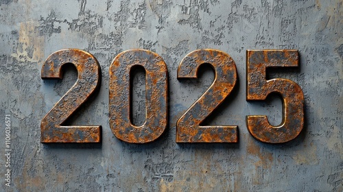Written text "2025" in an embossed metal font with rusty textures on a pale grey background.