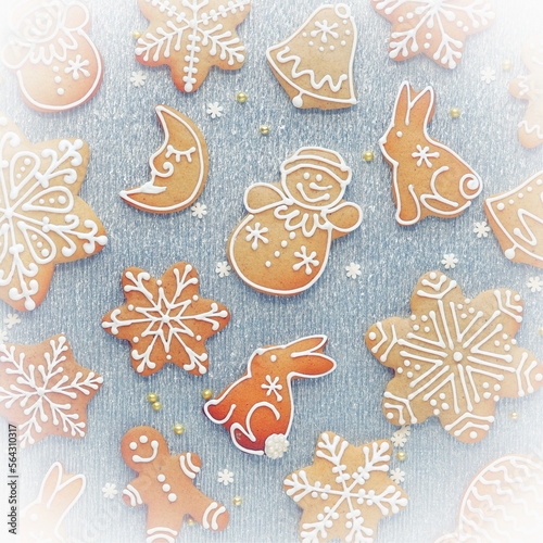 Xmas Cookies. Christmas Advent Gingerbread Decorations. Top View. White vignette. Postcard