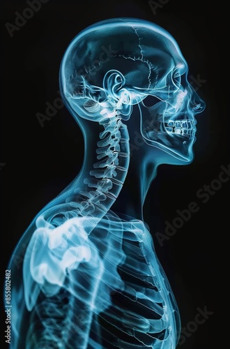 Xray of the human body, with visible bones and spine in blue color on black background.