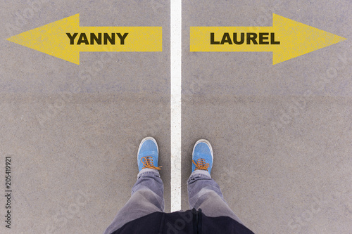 Yanny or Laurel text, internet audio voice hype on asphalt ground, feet and shoes on floor