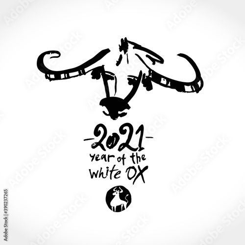 Year of the white Ox in Chinese zodiac. Black ink brush calligraphy symbol of the year 2021. Vector element for New Year's design in flat style. Illustration of 2021 year of the Ox.